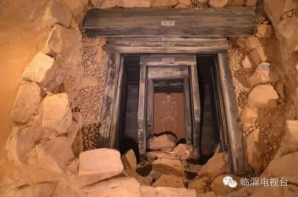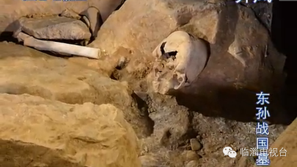 临淄区文物局考古队 王会田:好像这个骨架就是当时的盗墓贼盗取了文物之后,很可能触动了石子石块,形成了塌陷,把他砸里头了,他现在光露着上肢和头,下半部分很可能在石头底下。