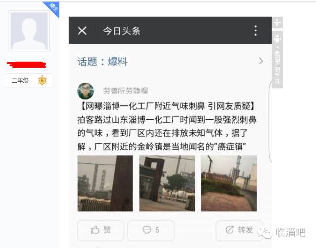 近日,今日头条登出一则有关临淄化工污染的新闻,爆料人指出,山东清源石化有限公司白天“防毒”,附近异味刺鼻,更爆料说,附近的金岭镇因周边化工污染而变成了“癌症镇”,引起了吧友的激烈讨论。