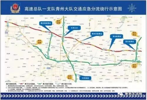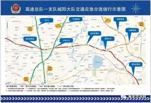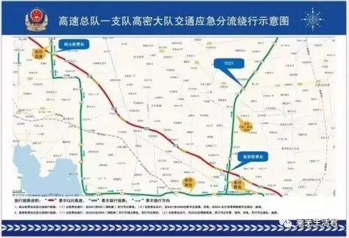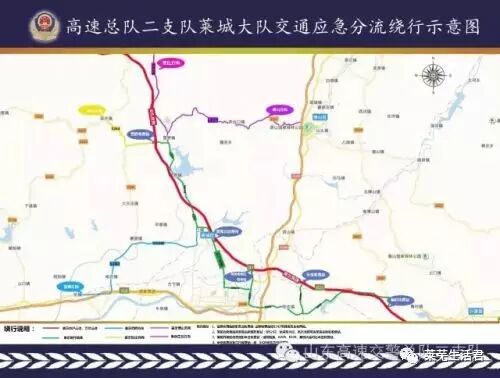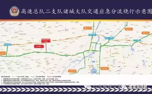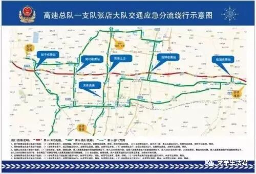 绕行图中红线表示G20高速,绿线表示绕行线路,箭头表示绕行方向。