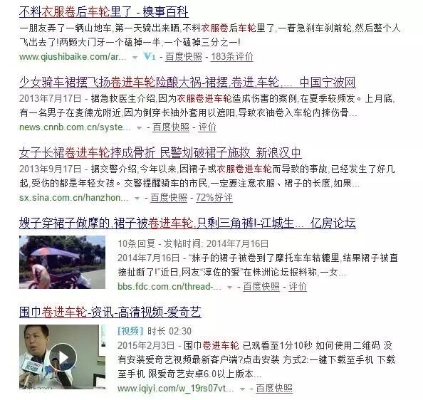 衣服、围巾卷进车轮的新闻我们时常可以看到、听到,主页君在此提醒大家:骑车时一定要注意衣服、裙子、围巾的长度,如果长度已经影响到行车安全时,千万不可大意,以免造成伤害。