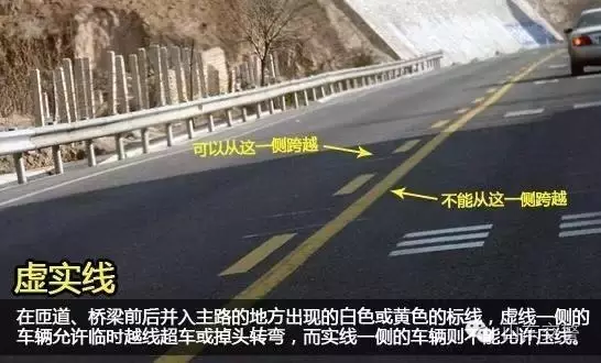 在匝道、桥梁前后并入主路的地方常常会出现白色或黄色的虚实线,虚线一侧的车辆允许临时越线超车或掉头转弯,而实线一侧的车辆则不能允许压线。