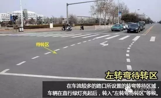 在车道较多、路面情况复杂的交通路口,为了提高机动车通过量,避免交通堵塞,常常会设立左转弯待转区,允许车辆在直行绿灯亮起后,转入“左转弯待转区”等候。