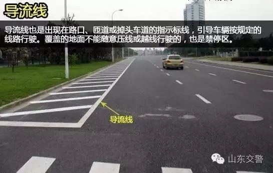 导流线也是出现在路口、匝道或掉头车道的指示标线,引导车辆按规定的线路行驶。但很多驾驶者误以为这是停车区域,导流线覆盖的地面是不能随意压线或越线行驶的,更不能在区域内停车。
