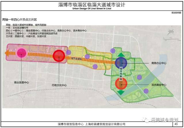 规划形成“两轴、一环、四心、六节点、三片区”的功能结构。最终发展为临淄城区的商务大道、文化慢生活街区、活力滨水街区。