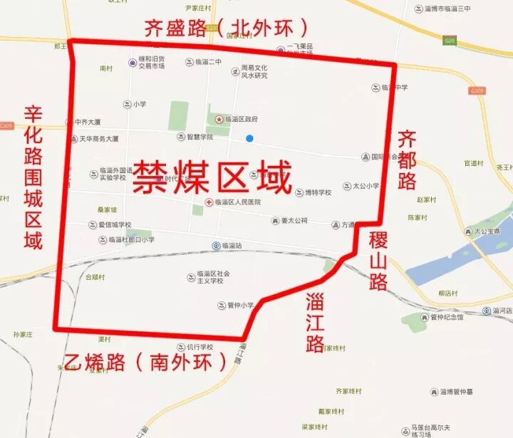 北至齐盛路(北外环)、东至齐都路—桓公路—稷山路—淄江路、南至乙烯路(南外环)、西至辛化路围城区域,以及完成以气代煤、以电代煤的区域。稷下街道孙娄东村,孙娄西村,辛店街道寨子村、安乐店村、辛店街村旧村改造或棚户区改造完成前暂不列入禁煤区范围。