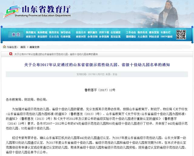 11月7日山东省教育厅网站公布了2017年认定通过的山东省省级示范性幼儿园、省级十佳幼儿园名单!