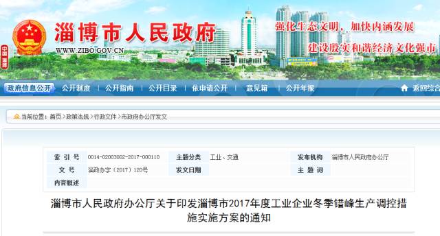 淄博市人民政府办公厅关于印发淄博市2017年度工业企业冬季错峰生产调控措施实施方案的通知