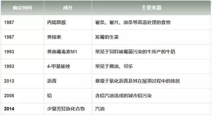 主要代表苏丹红、印刷油墨、次氯酸盐、汞及汞有机化合物、聚丙烯、聚乙烯、聚氯乙烯、玻璃纤维、茶叶、茶碱、糖精、静态磁场、维生素K、胆固醇、灭草隆等。