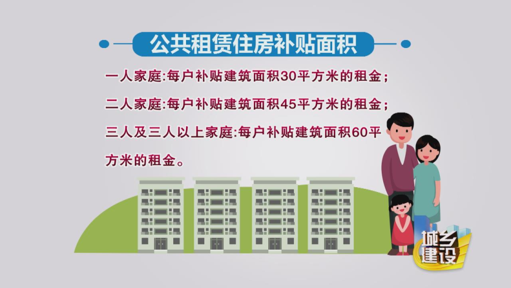 公共租赁住房补贴面积也有明确规定:一人家庭每户补贴建筑面积30平方米的租金;二人家庭每户补贴建筑面积45平方米的租金;三人及三人以上家庭每户补贴建筑面积60平方米的租金。