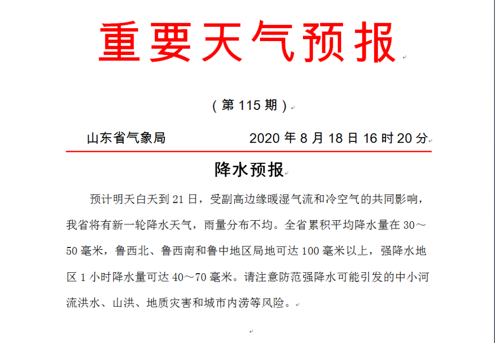 今天下午,山东省气象台也发布重要天气预报: 预计明天白天到21日,受副高边缘暖湿气流和冷空气的共同影响,山东将有新一轮降水天气,雨量分布不均。