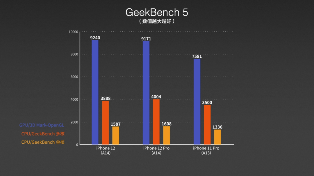 我们使用GeekBench 5对iPhone 12和iPhone 12 Pro进行跑分测试,相比A13芯片,A14的单核提升了约19%,多核提升了约11%,GPU提升了约22%。