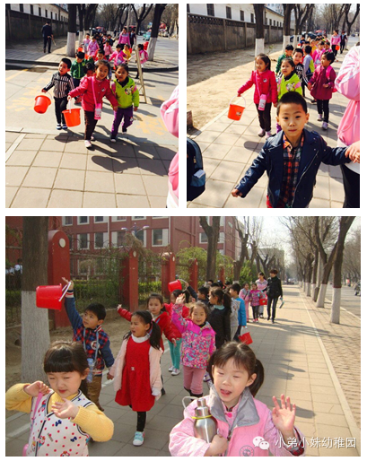 带好装备,徒步出发了!“我们小男生可要照顾好小女生哦!工具、水桶我们来提!”