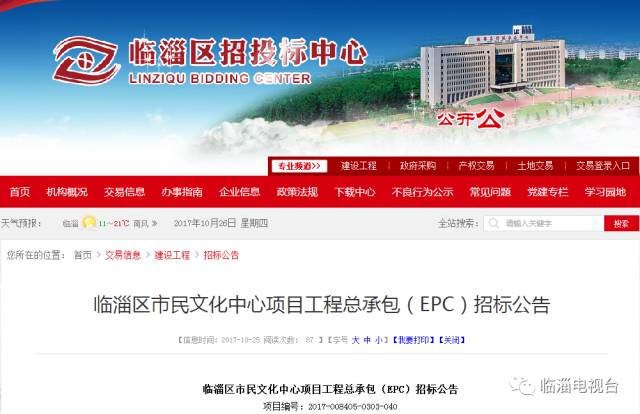 10月25日,临淄区市民文化中心项目发布工程总承包招标公告,公告内容显示,该项目计划于2017年11月21日开工,2021年4月23日竣工。