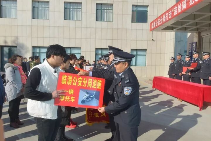 为进一步打击震慑犯罪,11月24日上午,临淄公安分局召开了2017年度打击“盗抢骗”犯罪成果展示暨退赃大会,集中返还部分案件追回的财物。