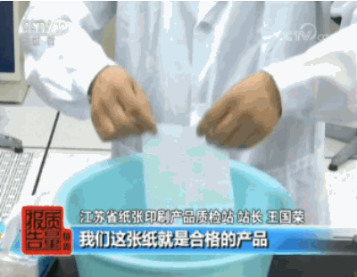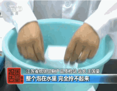 检测人员表示,消费者平时可以通过将纸巾纸浸泡在水盆里的简单实验,检测纸品的纵向湿抗张强度。如果泡过水的纸巾纸完全拎不起来,说明它就是一款不合格产品。