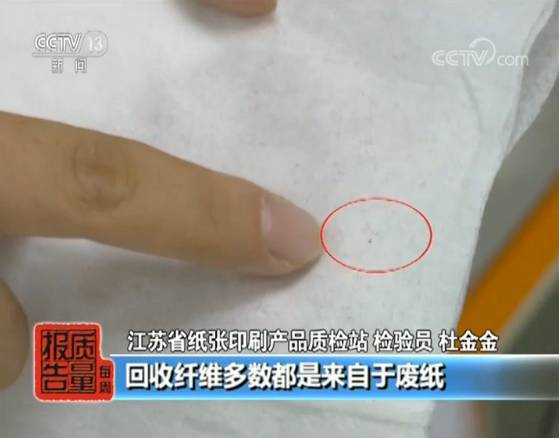 除了内装量不足以外,本次检测发现纸巾纸存在的第二大问题是,生产企业违规使用回收纤维作为原料。检测人员指出,原生木浆生产的纸巾纸,颜色为本白色,而回收纤维生产的纸巾纸,颜色发灰发暗,同时,其表面通常会有废旧原料的残留墨点。“每吨的差价大约在两千块钱左右,有的生产企业为了降低成本,违规使用了含有回收纤维的纸巾纸原纸。”