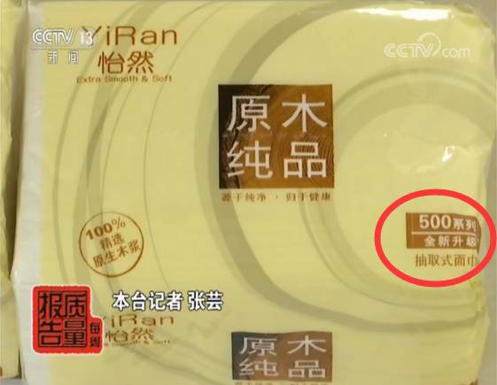 下面这包标称为怡然牌的纸巾纸,其外包装上标示的内装量是500张,但经过检测,这包纸巾的内装量仅有132张,少了368张,仅有明示值的四分之一左右。