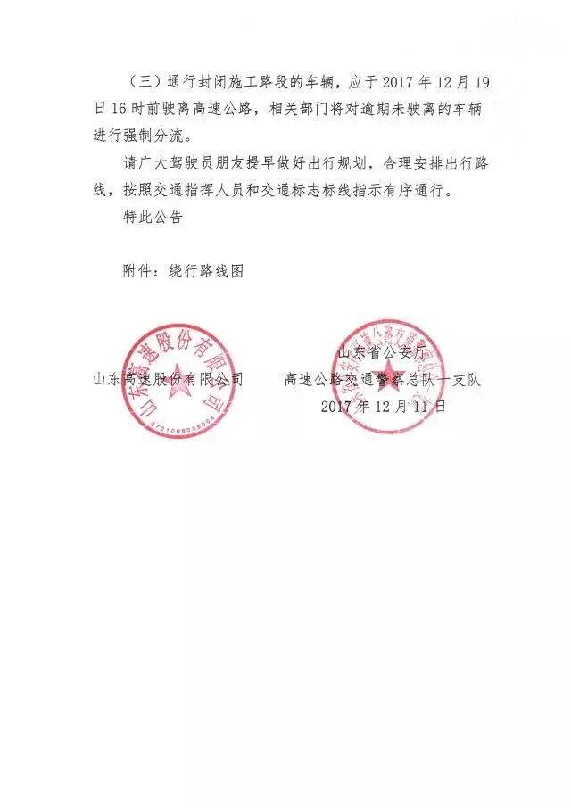 (三)通行封闭施工路段的车辆,应于2017年12月19日16时前驶离高速公路,相关部门将对逾期未驶离的车辆进行强制分流。