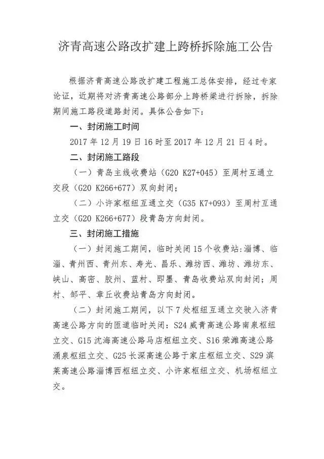 (一)封闭施工期间,临时关闭15个收费站:淄博、临淄、青州西、青州东、寿光、昌乐、潍坊西、潍坊、潍坊东、峡山、高密、胶州、蓝村、即墨、青岛收费站双向封闭;周村、邹平、章丘收费站青岛方向封闭。