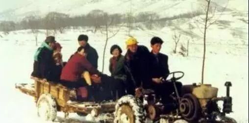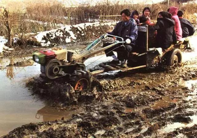 除了骑车,就数这拖拉机快了,犁地的轮胎,连防滑链都省了。走亲神器,底盘高越野性强,适应各种路况通行!这照片有种老宣传海报的意思!