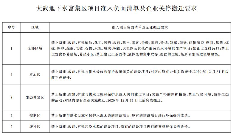 这两个区域是大武地下水富集区的主要补给径流区,禁止审批与供水、保护水源无关的项目,现有的企业实施逐步搬迁。