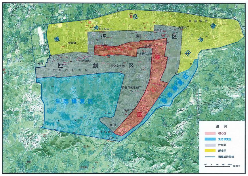 具体范围是:309国道以南、淄河以西、刘征水源地一级保护区北边界—冯北路、柳行村东地界—乙烯北路—冯北公路、胶济铁路—金岭铁矿专用铁路线以东的闭合区域,面积约123.23平方公里。