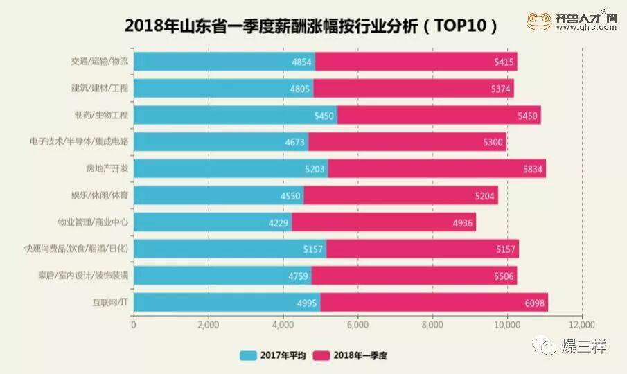 通过上图来看涨幅排名前十的行业,薪酬涨幅全部超过500元。而以石油化工、机械加工、金属冶炼为代表的传统重工业则无一上榜。随着山东省“新旧动能转化”的加快,以互联网/IT行业为代表的“高精尖”行业将成为优先发转对象,而通过行业薪酬涨幅对比也能发现这样现象。山东互联网/IT行业一季度薪酬高达6098元,位列全省第一,对比2017年全年平均数据,其涨幅突破率先“千元”再次领跑全省。