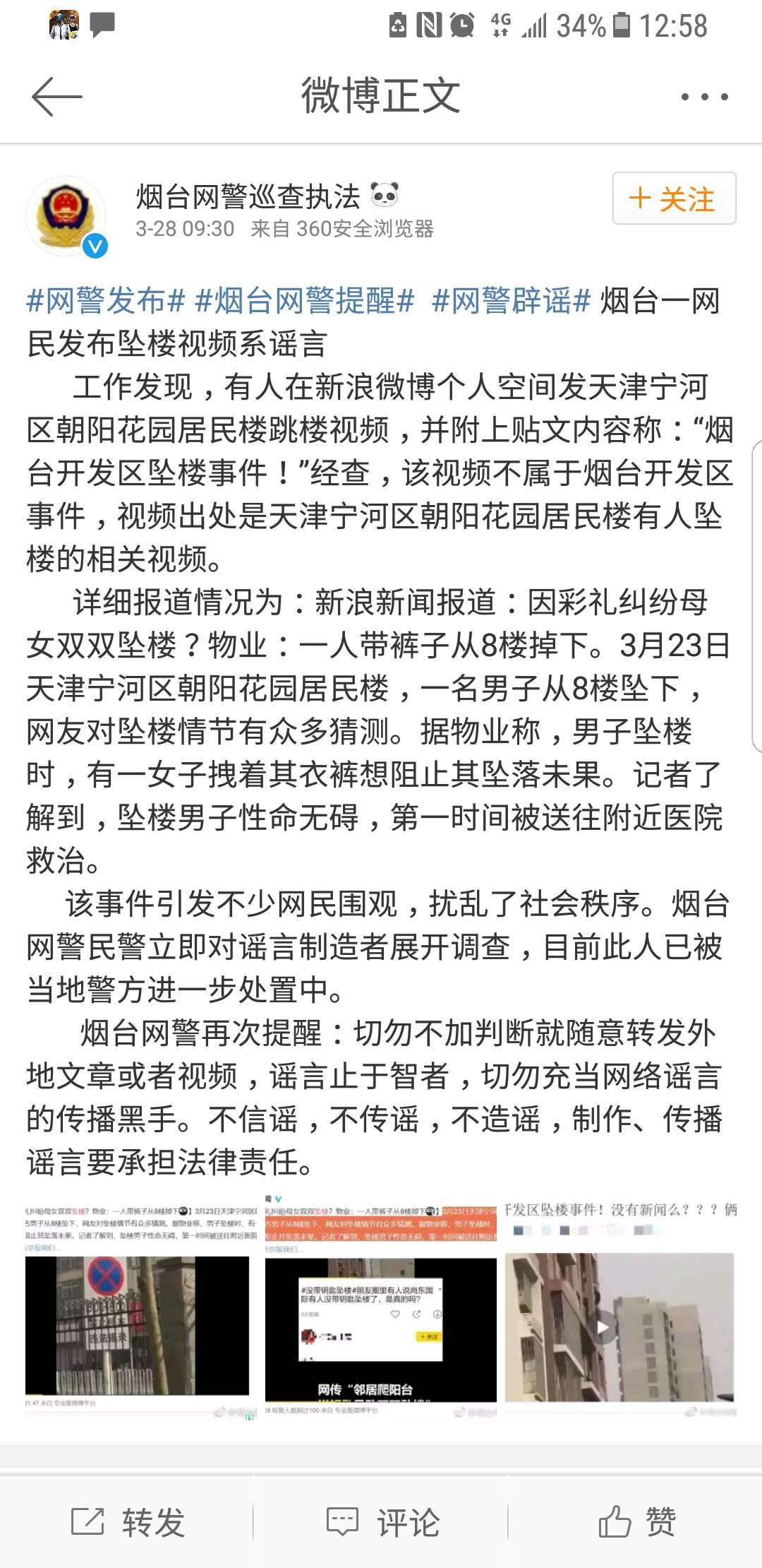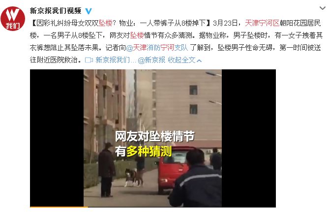 3月23日,天津宁河区朝阳花园居民楼,一名男子从8楼坠下,网友对坠楼情节有众多猜测。据物业称,男子坠楼时,有一女子拽着其衣裤想阻止其坠落未果。记者向@天津消防宁河支队 了解到,坠楼男子性命无碍,第一时间被送往附近医院救治。