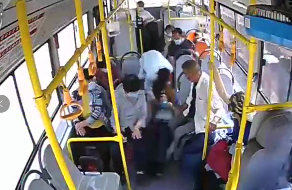 男乘客突发心脏病,安全员韩峰在其身旁守护。(视频截图)