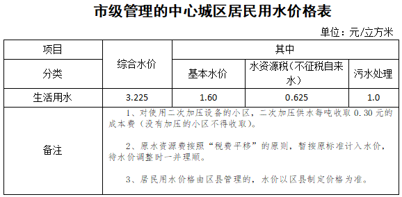 居民用水综合水价中仅基本水价实行阶梯价格,代征收的水资源税、污水处理费等不实行阶梯价格。阶梯价格按照1:1.5:3比例确定,各阶梯综合水价计算公式为:阶梯综合水价=基本水价×阶梯水价比例+水资源税+污水处理费