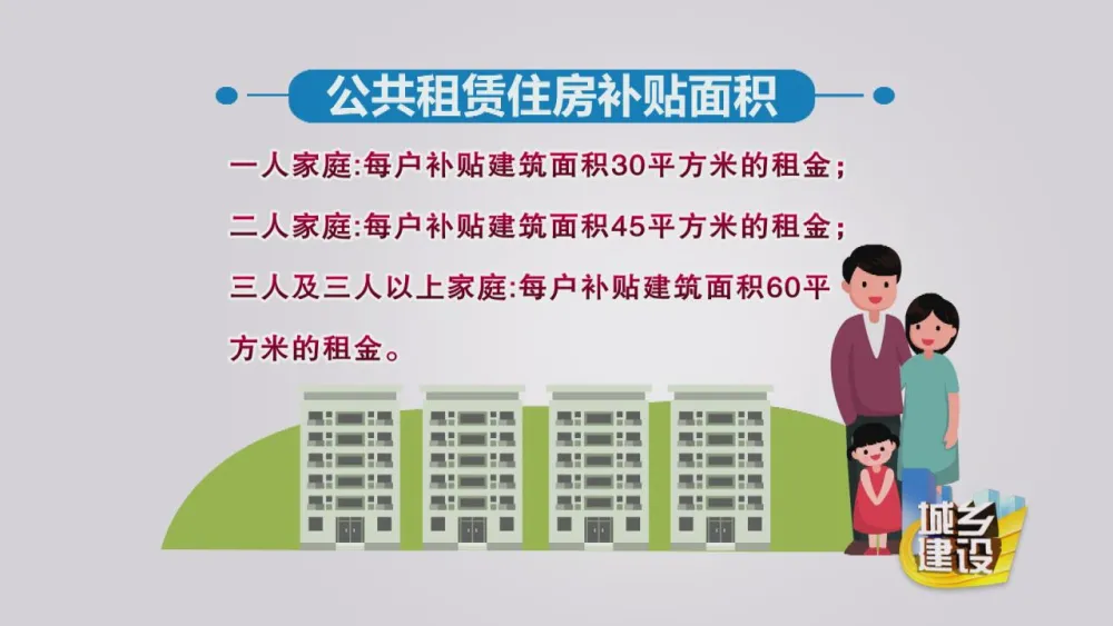 公共租赁住房补贴面积也有明确规定:一人家庭每户补贴建筑面积30平方米的租金;二人家庭每户补贴建筑面积45平方米的租金;三人及三人以上家庭每户补贴建筑面积60平方米的租金。
