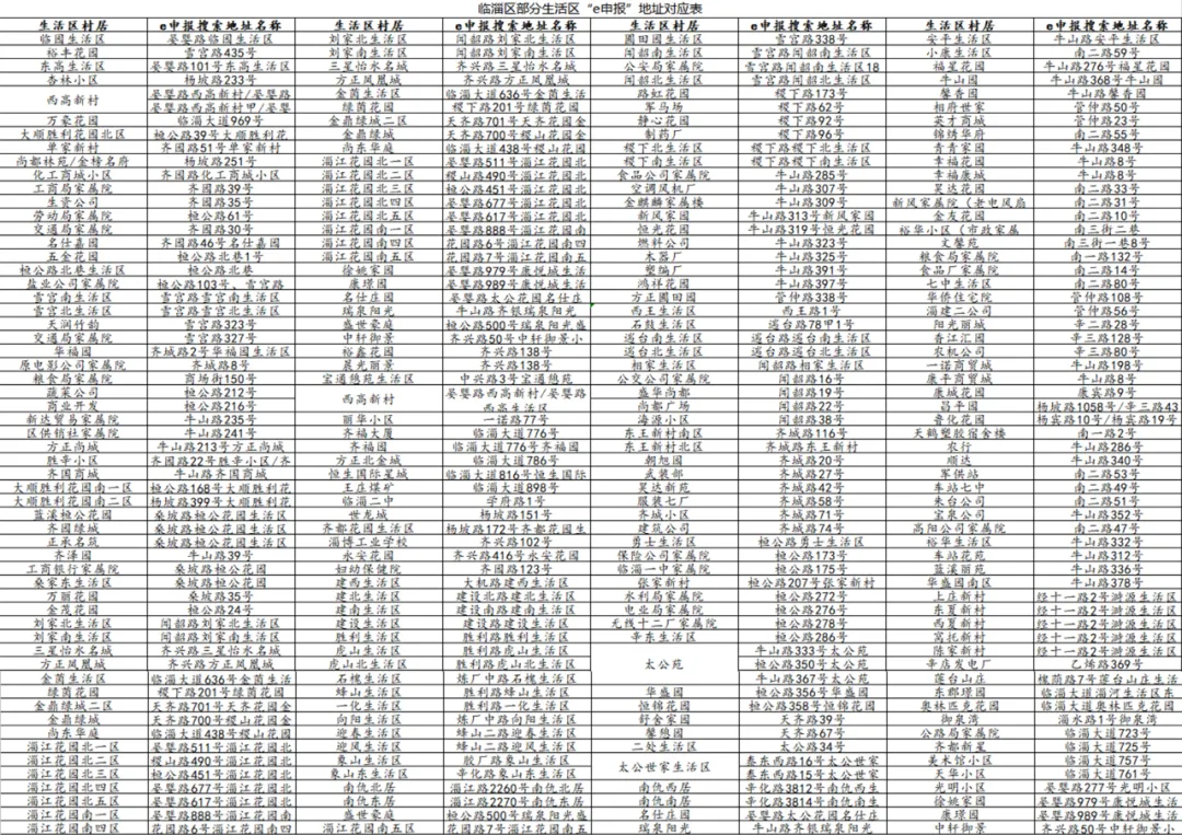 为方便群众自主申报,临淄公安分局整理了部分地址名称对应表,居民朋友们可参照申报,也可拨打居住地派出所电话进行咨询申报。