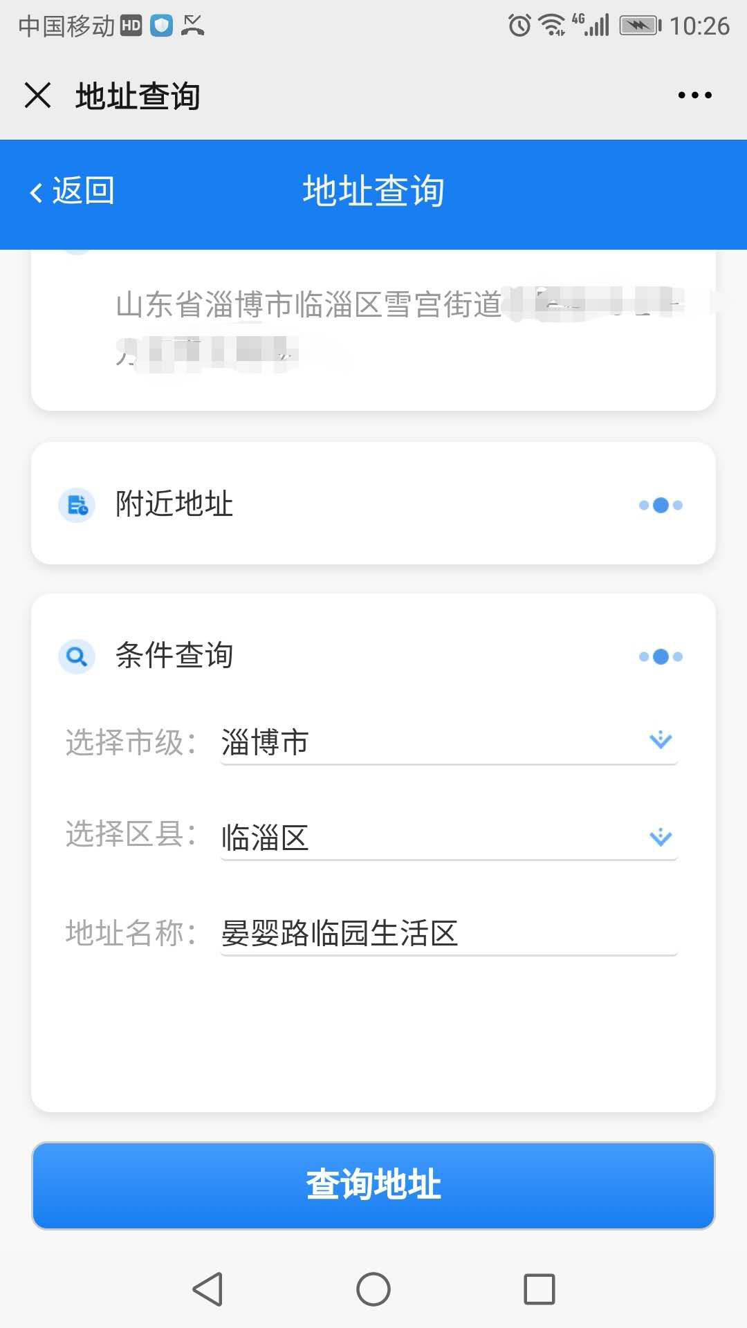 3.选定住址:选择“查地址,立即申报”,选择“淄博市”“临淄区”,在“地址名称”处,输入小区或村居名称,如“皇城镇于家村、晏婴路临园生活区、晏婴路101号东高生活区”(户口所在地与实际居住地一致的,可以参照户口簿地址;户口所在地与实际居住地不一致的,可参看下面“临淄区部分e申报地址对应表”的对应地址名称申报或拨打居住地派出所电话咨询申报。),查询到地址后,选择居住的房屋信息。
