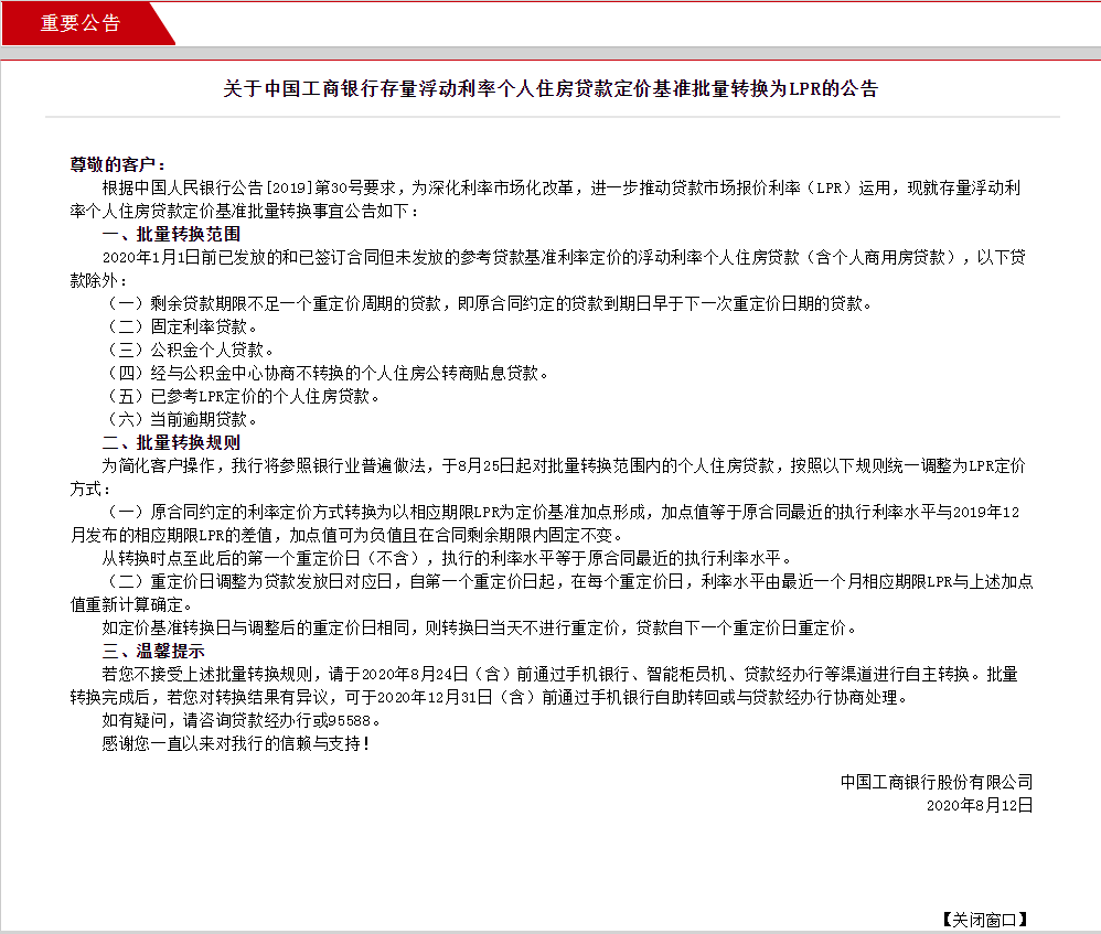 8月12日,中国工商银行、中国建设银行、中国农业银行、中国银行、中国邮政储蓄银行等五家国有大行均发布公告称,将于8月25日起,对符合转换条件但尚未办理转换的存量浮动利率个人住房贷款定价基准批量转换为LPR。