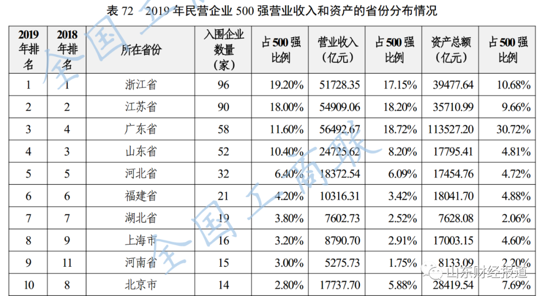 2015-2019年民营企业500强前10省份分布