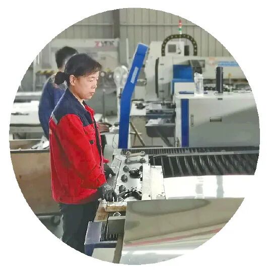图:厨房设备生产车间内,陈营村村民正在操作激光切割机切割不锈钢板材。