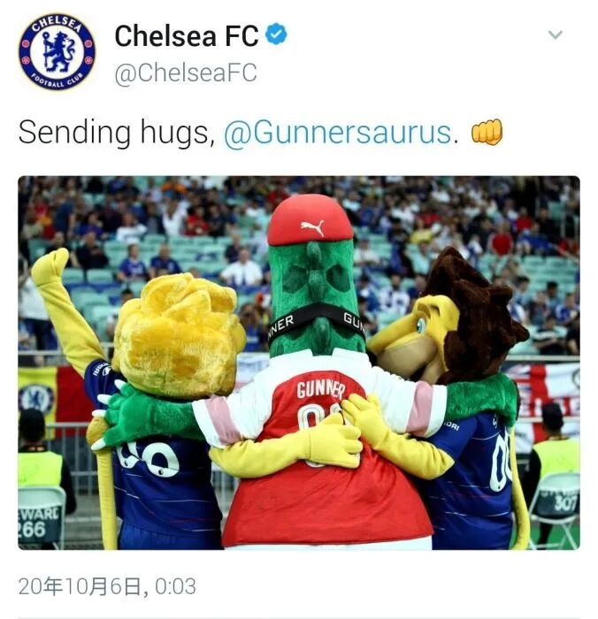 而阿森纳这个看起来缺乏人情味的做法,其他足球俱乐部也并不赞同。同为英超球队的切尔西就在社交媒体发布了切尔西的两个吉祥物与枪手龙的合影,并写道:给你一个拥抱。
