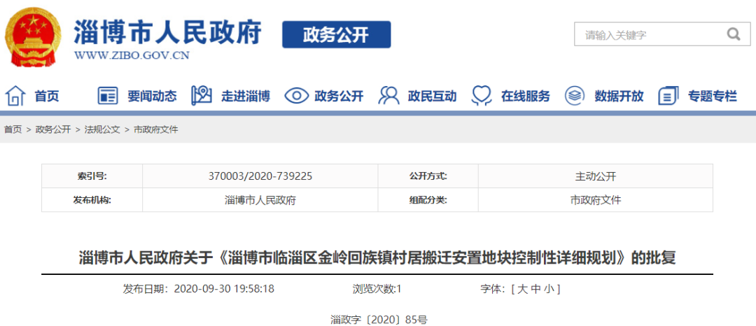 近日淄博市人民政府网站发布淄博市人民政府关于淄博市临淄区金岭回族镇村居搬迁安置地块控制性详细规划》的批复