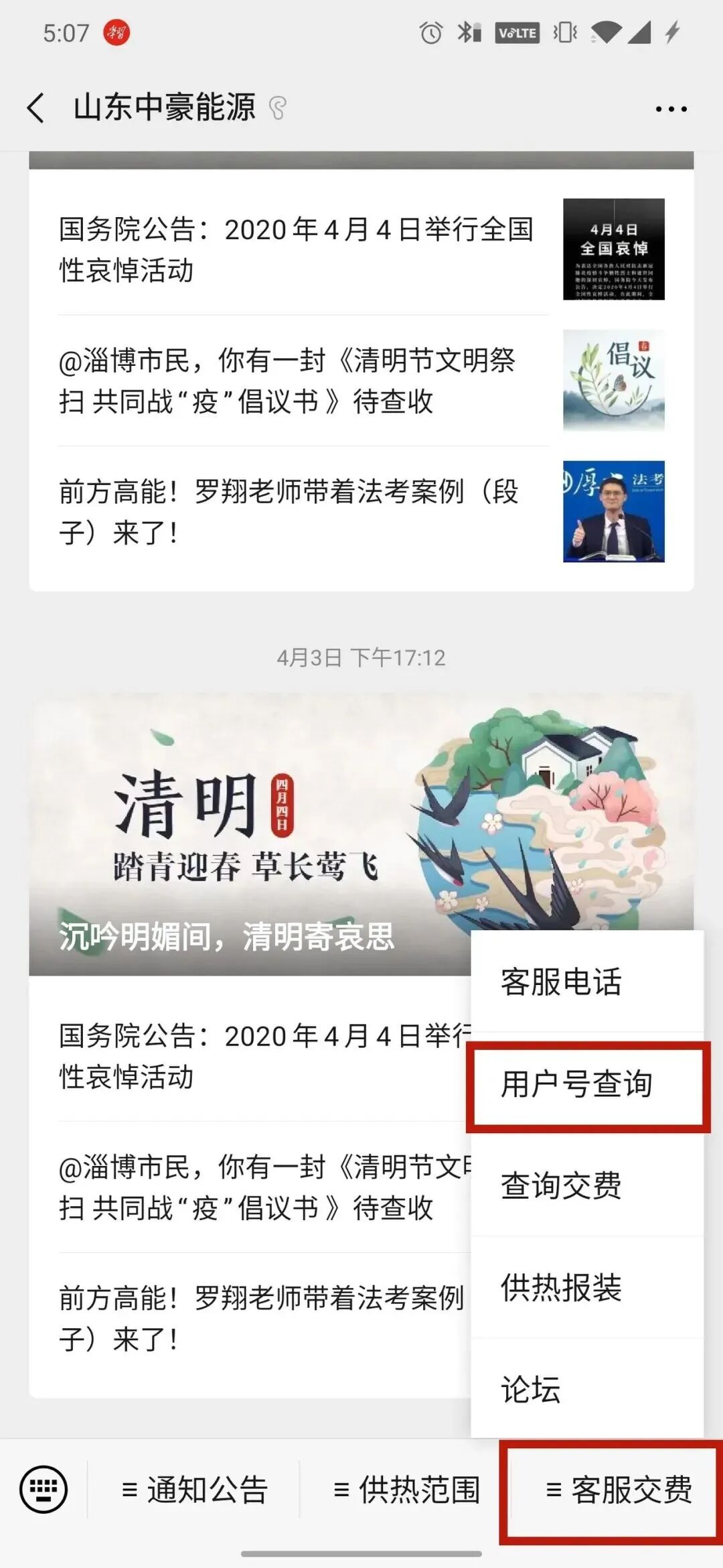 关注“山东中豪能源”微信公众号,点击“客服交费”,按提示完成交费;