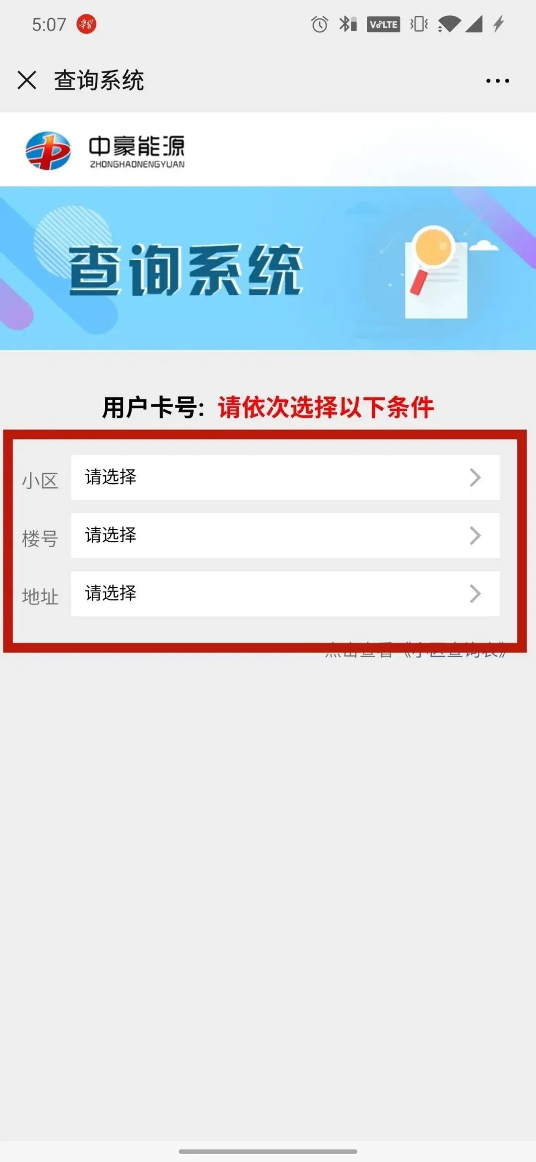 步骤三:进入查询系统页面后,依次正确选择小区、楼号、地址等三个选项,即可查询到供暖用户卡号。