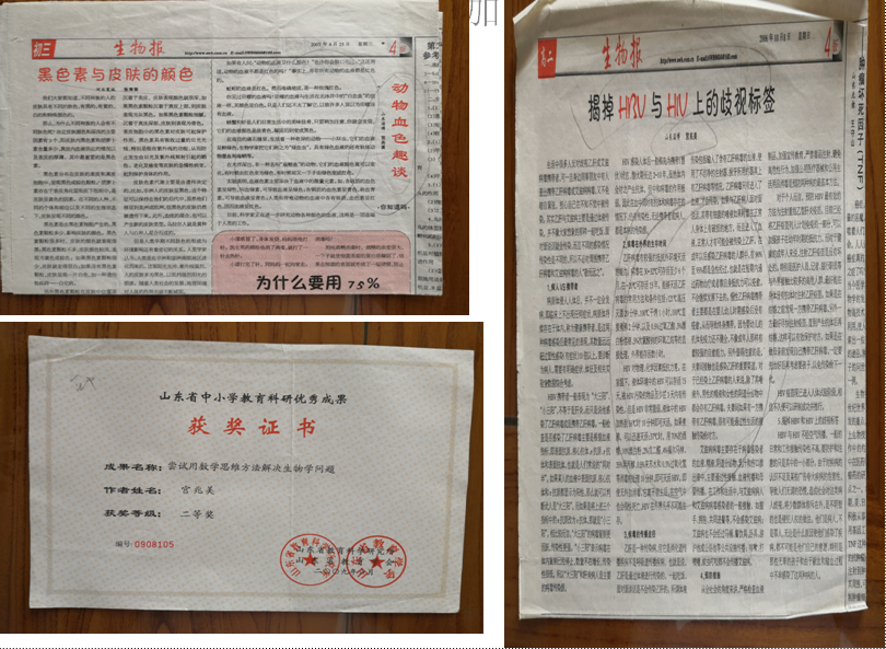 在感觉自己羽翼渐丰满的时候,宫老师又把精力投注于学校教研组的课题研究中,协助当时担任实中生物学科主任的张杰芳老师圆满得完成了《初中生物教学与生命教育的实践与探索》的课题研究,荣获山东省教学研究成果贰等奖。