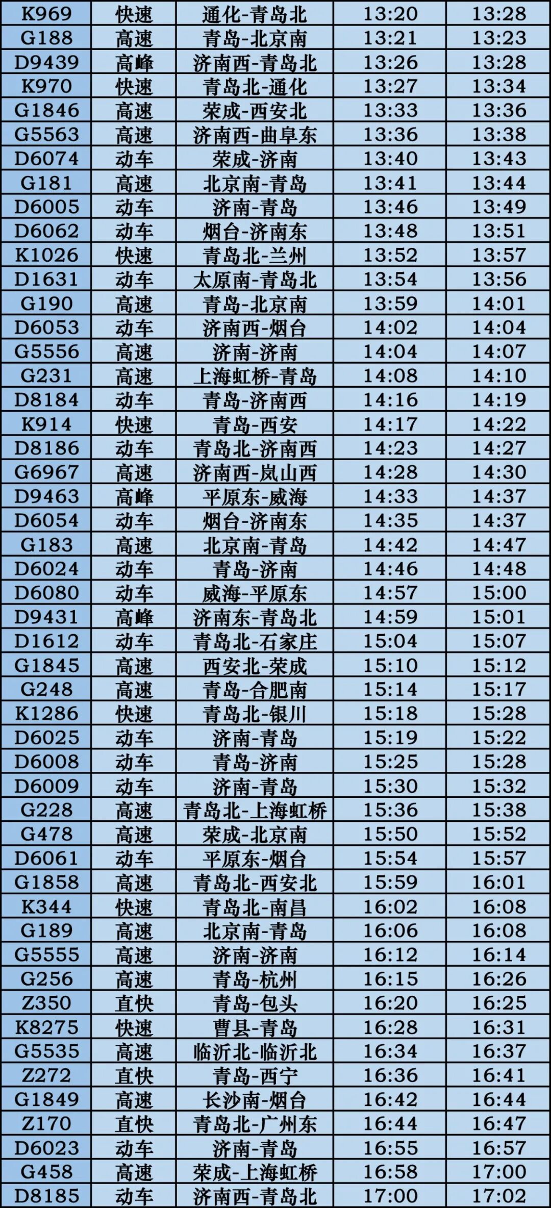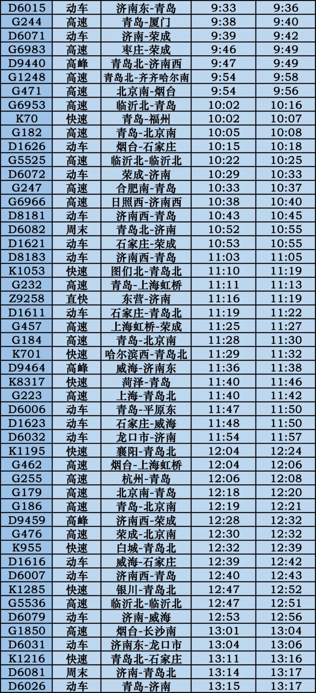 改始发终到站列车3.5对。济南-荣成D6075次改威海终到、青岛-济南D6004次改济南西终到、济南-烟台D6053次改济南西始发、青岛北-济南西高峰线D9468次改青岛始发、济南西-青岛北高峰线D9471次改青岛终到、济南-青岛北高峰线D9473次改青岛终到、青岛北-济南西高峰线D9474次改青岛始发。
