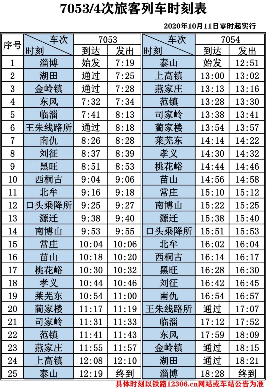 7053/4次“公益慢火车”运行时刻调整。7053次运行时间由原来的5小时10分钟,缩短至5小时;7054次运行时间由原来的5小时43分钟,缩短至5小时37分钟,7054次终到淄博火车站时间提前至18:28。