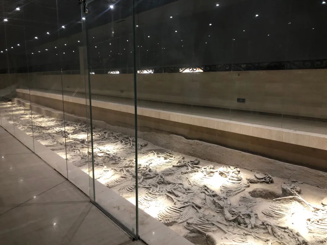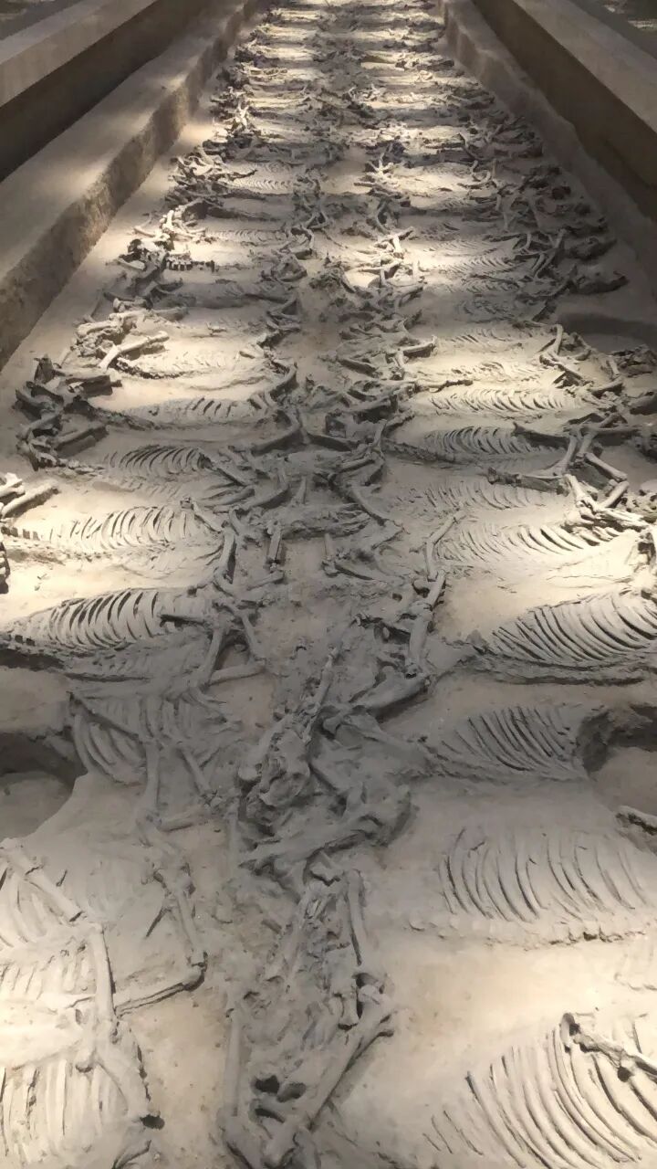 (录音:我们齐景公墓殉马坑保护展示工程,在前期的施工过程当中,有了新的考古发现,所以,根据文物保护的要求,我们重新上报了我们的保护展示设计方案,经国家文物局批准之后,我们又按照新的方案,实施了保护展示工程。目前呢,我们的展馆的改扩建工程正在实施,预计明年的3月份可以完成主体建筑,我们争取在明年的9月份全部完工并对公众开放。目前呢,我们的工程施工正在紧张的进行当中。同时呢,齐头并进的是,我们的内部的展陈的方案设计以及我们的其他的展项的设计。等到我们正式开园之后呢,我们不仅能够展示原来的殉马坑,还能够完整的展示,春秋晚期齐景公墓的整个的陵体的形制,包括我们的主墓、器物坑、以及我们的殉马坑,还有我们模拟考古的区域,在我们对社会开放之后,我们的整个景区里面,还会配置相应的这种多媒体的影视,以及体验、VR体验之类的这种新科技的这种游览项目。)