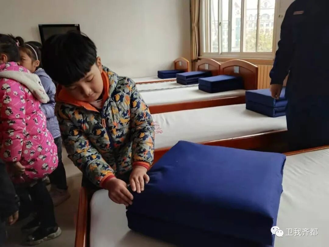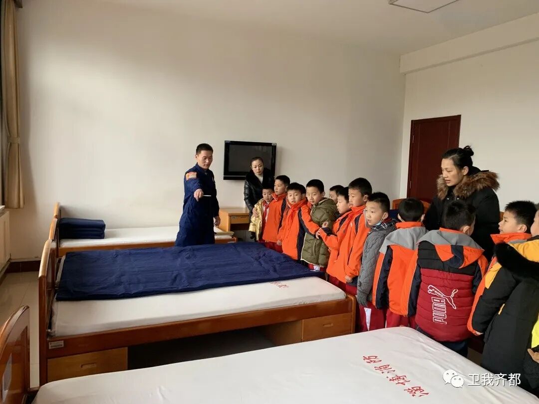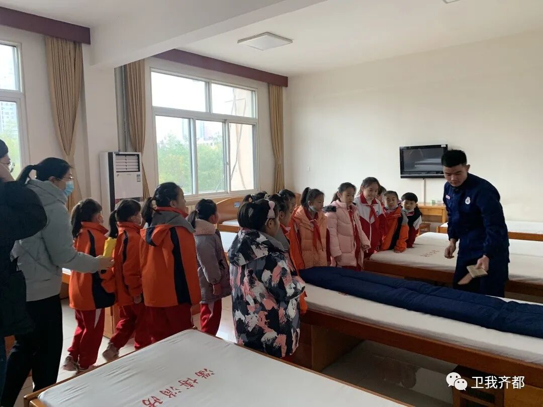 消防员带领师生们有秩序地参观班级宿舍,并向师生展示那整齐的豆腐块被子,师生们也积极参与其中。