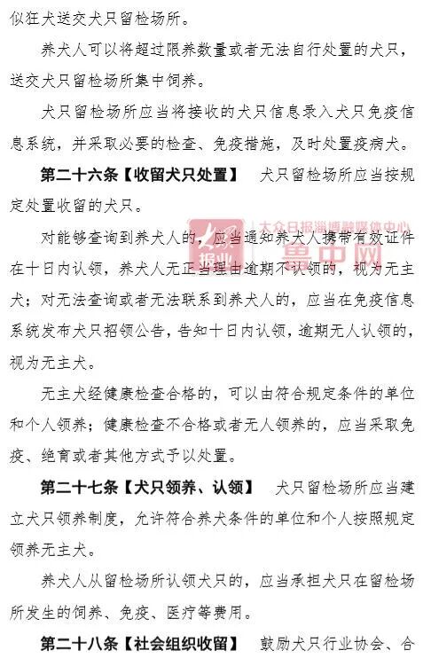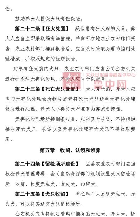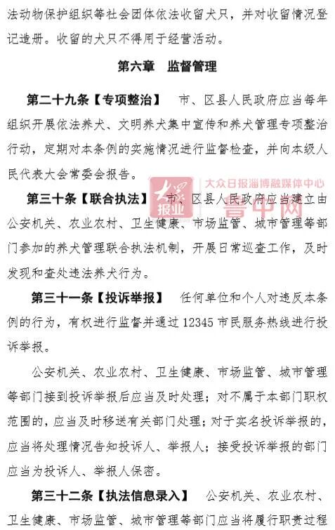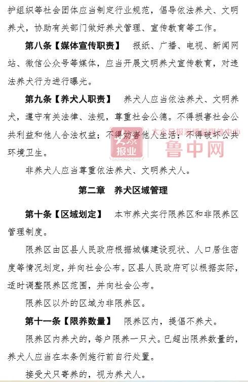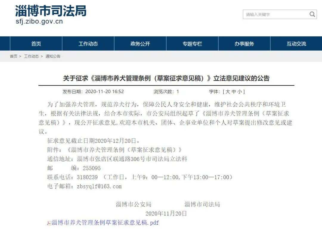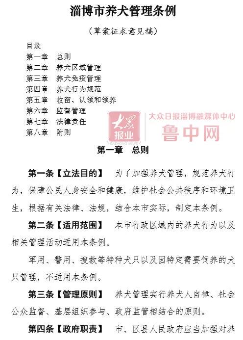 11月20日,淄博市公安局、淄博市司法局联合发布关于征求《淄博市养犬管理条例(草案征求意见稿)》(以下称条例草案)立法意见建议的公告,将针对条例草案内容向社会公开征求意见,截止日期为12月20日。根据条例草案内容,淄博将划定限养区,该区域内每户限养一只犬。
