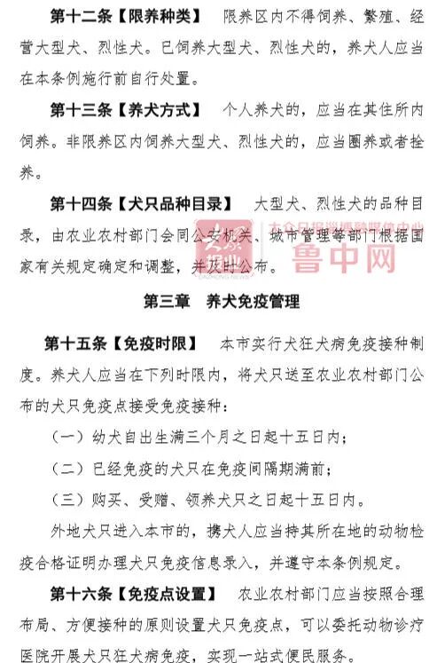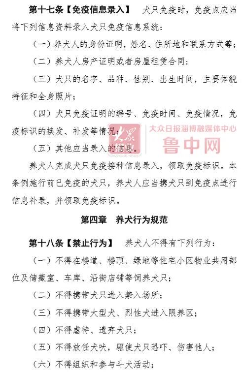 条例草案还对养犬免疫管理进行了规定,明确淄博市实行狂犬病免疫接种制度。养犬人应在规定时限内将犬只送至农业农村部门公布的犬只免疫点接受免疫接种。犬只免疫时,应当将养犬人身份证明等信息录入犬只免疫信息系统,领取免疫标识。