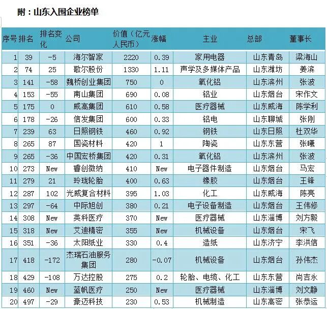 此外,跻身前十的还有中国平安保险(1.48万亿元)、蚂蚁集团(1.4万亿元)、拼多多(1.14万亿元)、华为(1.1万亿元)、京东集团(9960亿元)、字节跳动(7000亿元)以及美的集团(6280亿元)。今年山东共有20家企业上榜,其中海尔智家全国排名39位,省内排名第一,企业价值2220亿元人民币,涨幅39%;歌尔股份排名74位,较去年相比排名提高25位,企业价值1330亿元人民币,涨幅高达111%。海尔智家、歌尔股份是山东仅有的两家步入千亿俱乐部的企业。