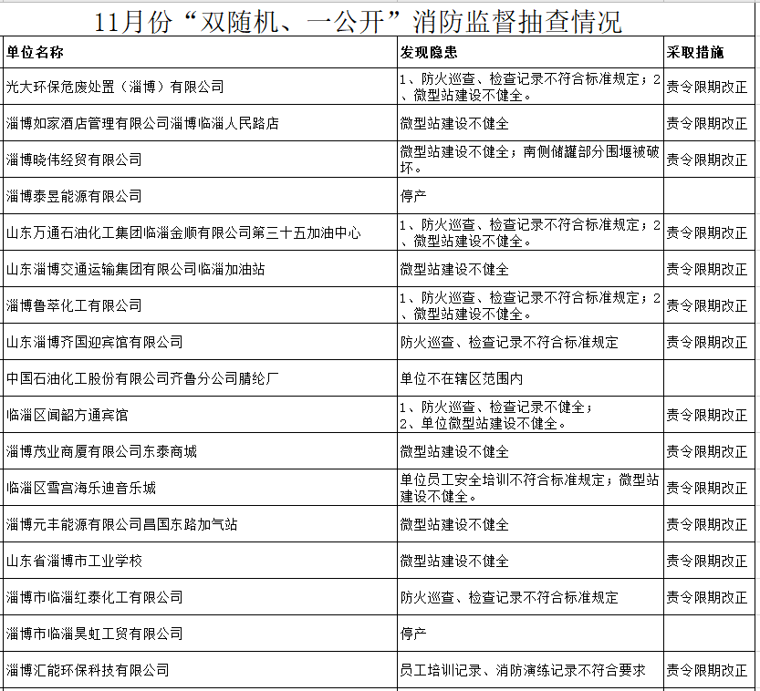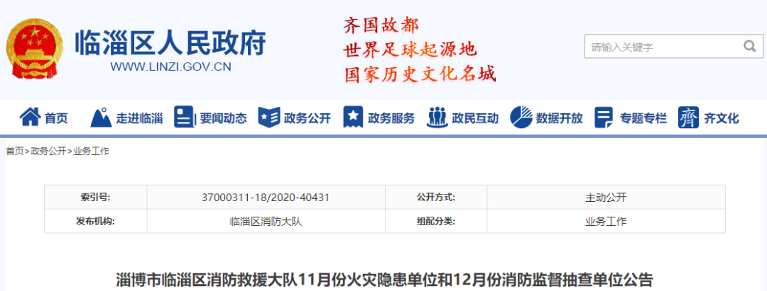 近日临淄区人民政府网站发布临淄区消防救援大队11月份火灾隐患单位12月份消防监督抽查单位公告。