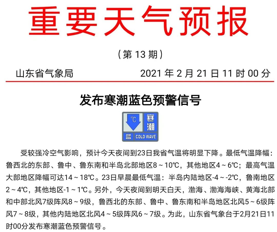 山东省气象台于2月21日11时00分发布寒潮蓝色预警信号